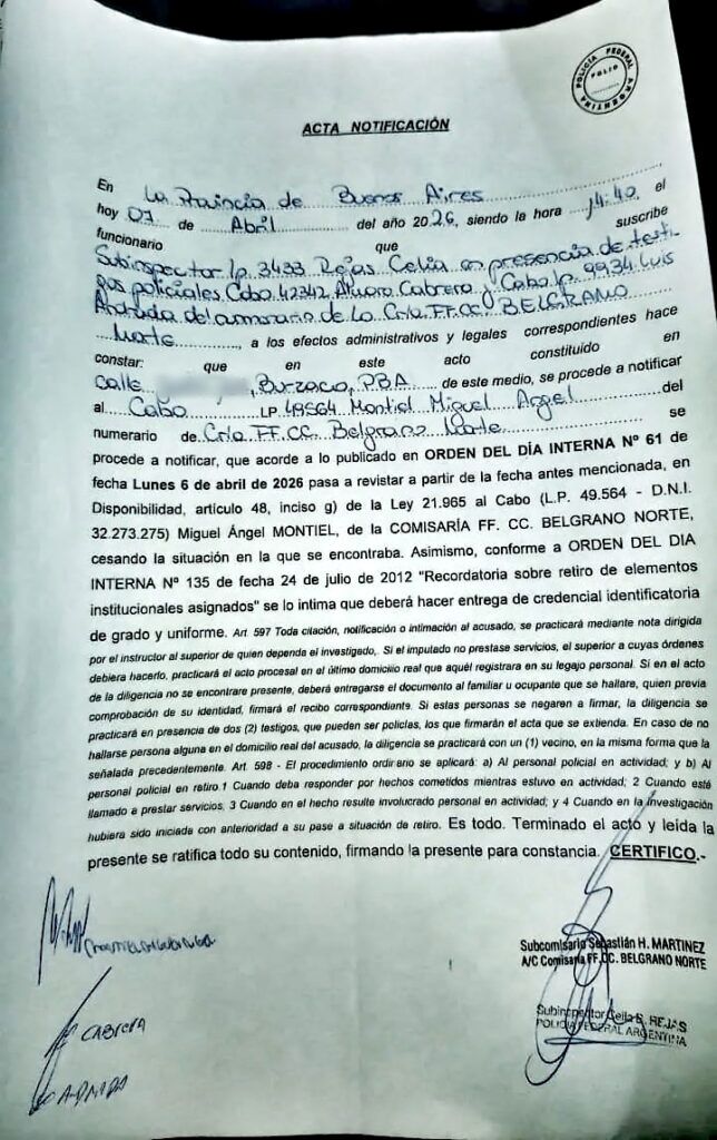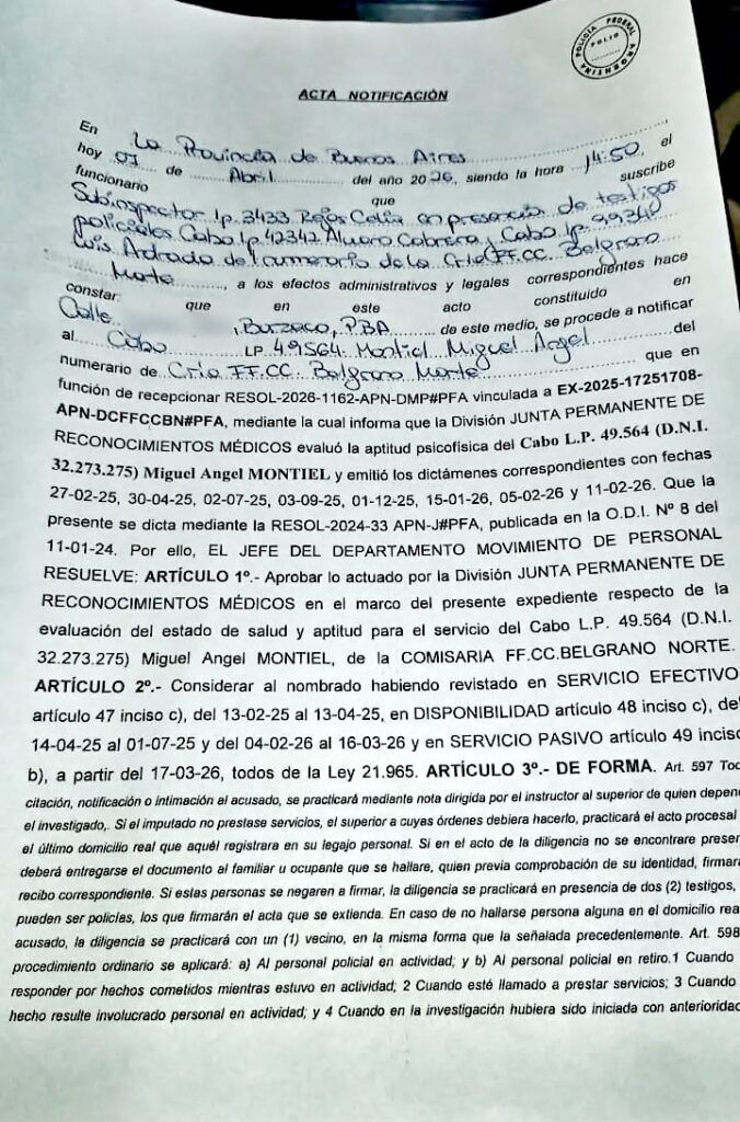 En paralelo, el asedio continuó en el plano administrativo con una desprolijidad que roza el absurdo. La Subinspector Celia Rejas —como encargada— y los cabos Álvaro Cabrera y Luis Andrada —como testigos— se presentaron para notificar al denunciante de resoluciones que exponen el apuro de la cúpula por desplazarlo. En un acto de negligencia documental, las actas oficiales registran periodos de “disponibilidad” fechados erróneamente en 2025, un yerro técnico que demuestra cómo se están armando expedientes a contrarreloj para intentar dar un barniz de legalidad a la persecución.