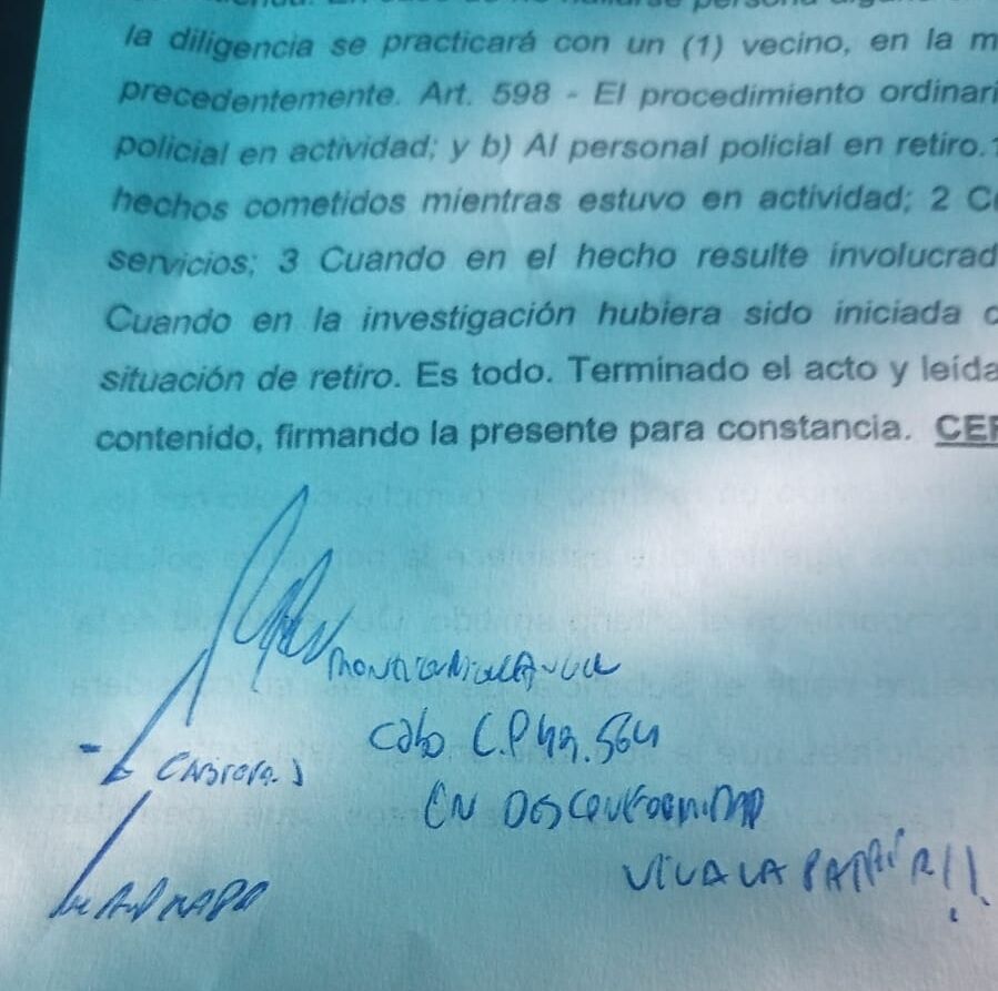 Su capacidad de anticipación fue milimétrica. Sólo 12 horas después de su aparición televisiva, la cúpula policial envió a su domicilio el acta de defunción de su carrera policial. Al momento de estampar la firma en el acta que pretende silenciarlo, el cabo, retirado del Ejército, dejó un mensaje de puño: “En disconformidad. ¡Viva la Patria!”.